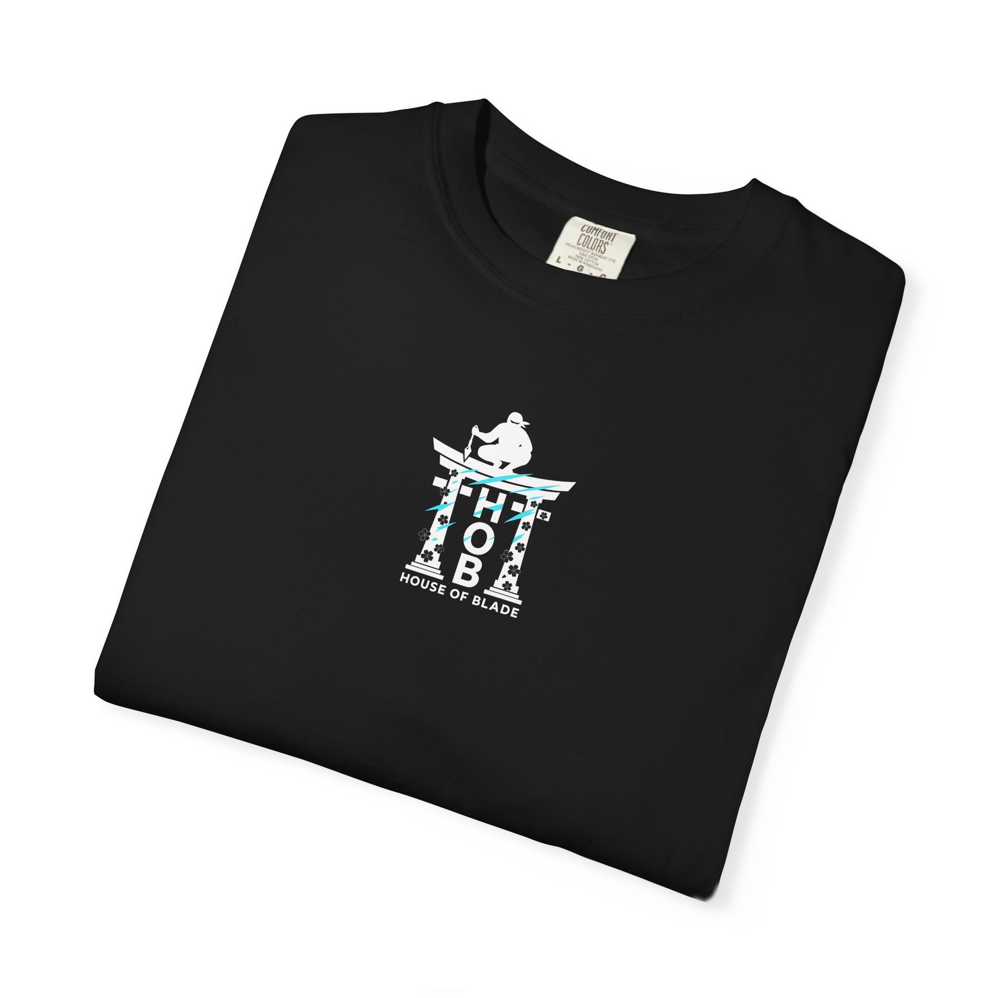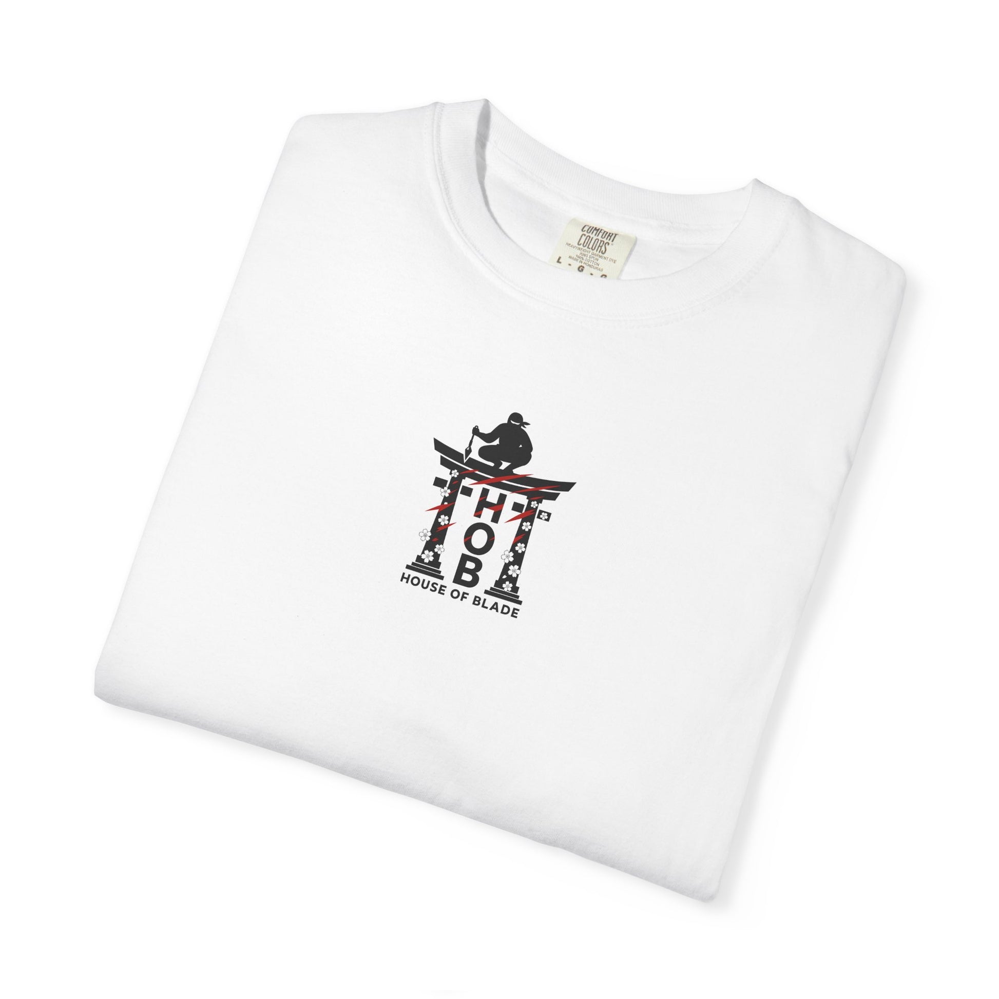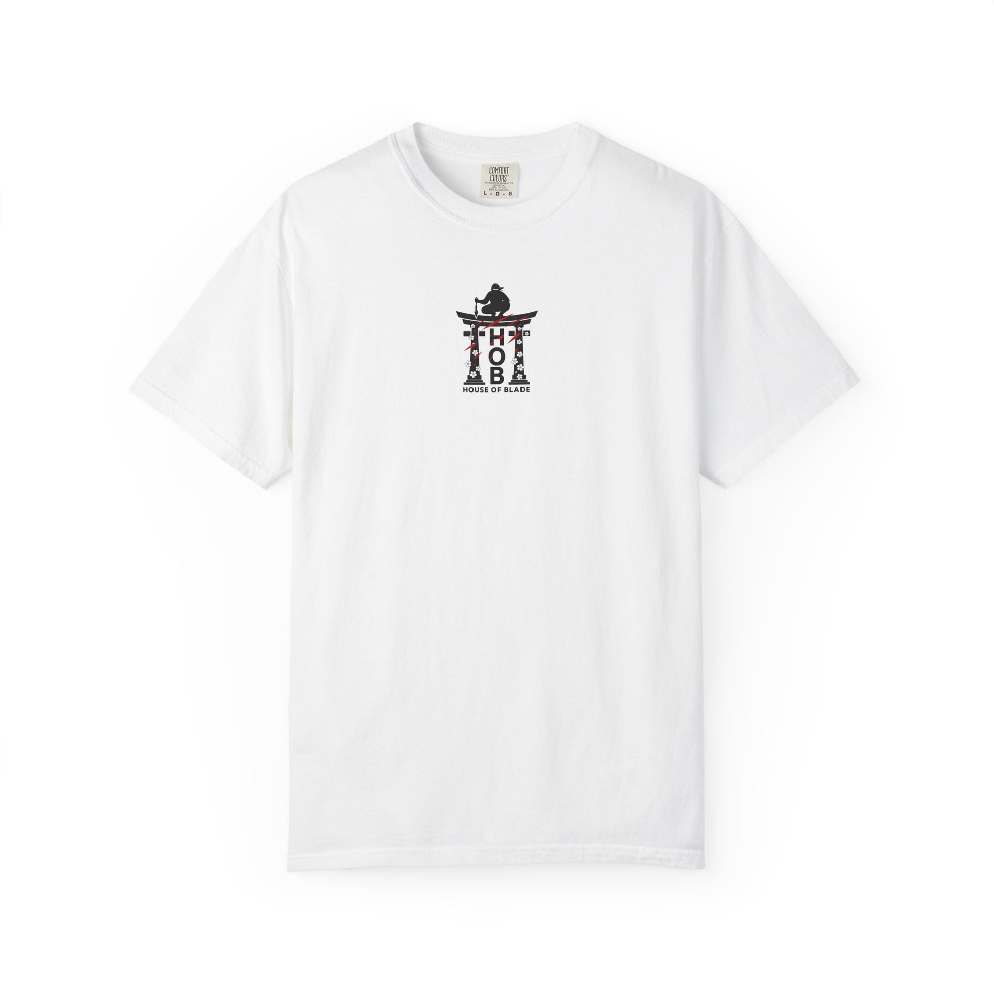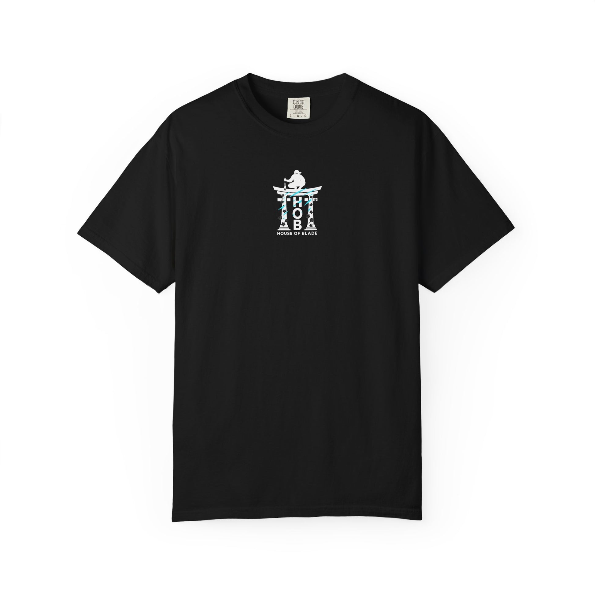 A lone figure rests atop the House of Blade torii gate, meditating at the edge of conflict. Calm. Centered. Watching the world, but moving only when it’s time. The vertical H → O → B sits like pillars beneath them — a code of patience, precision, presence.