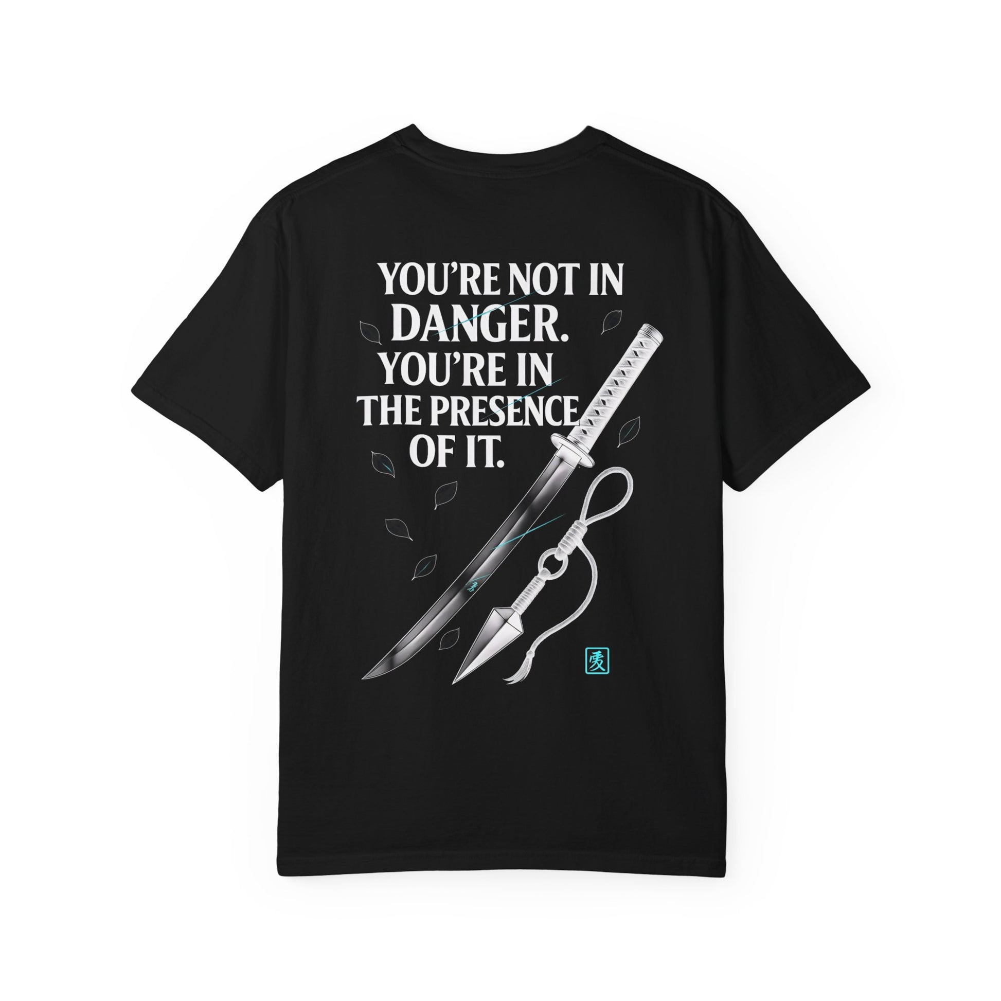 On the back, a katana glints in the light, flanked by falling leaves — the kind of stillness that comes before everything changes. Beside it, a kunai tied with cord, resting... but never forgotten. These aren’t weapons drawn in rage — they’re symbols of restraint, discipline, and capability held in check.