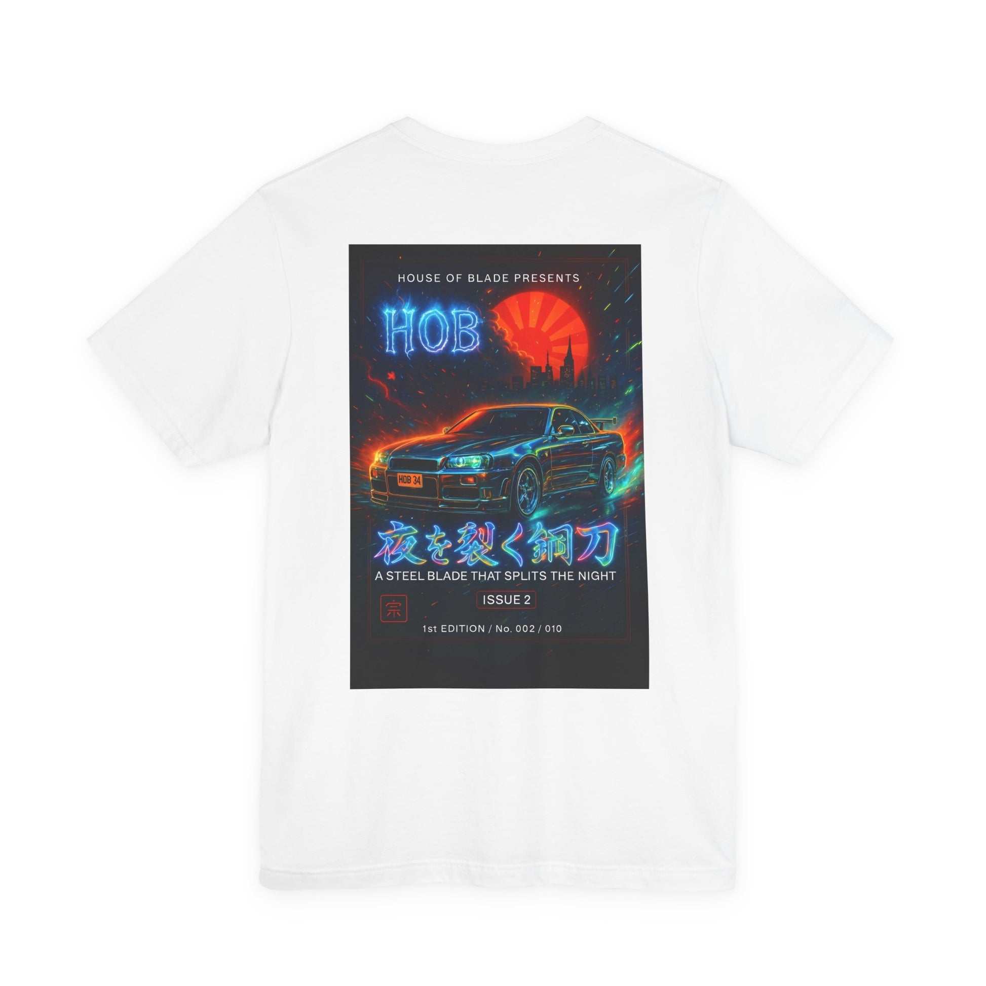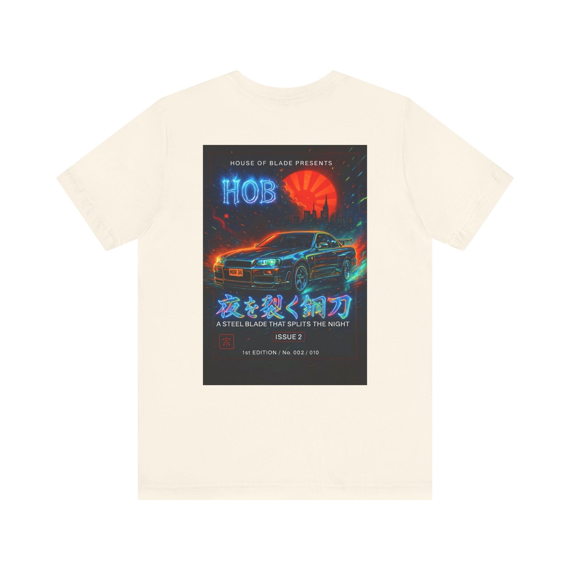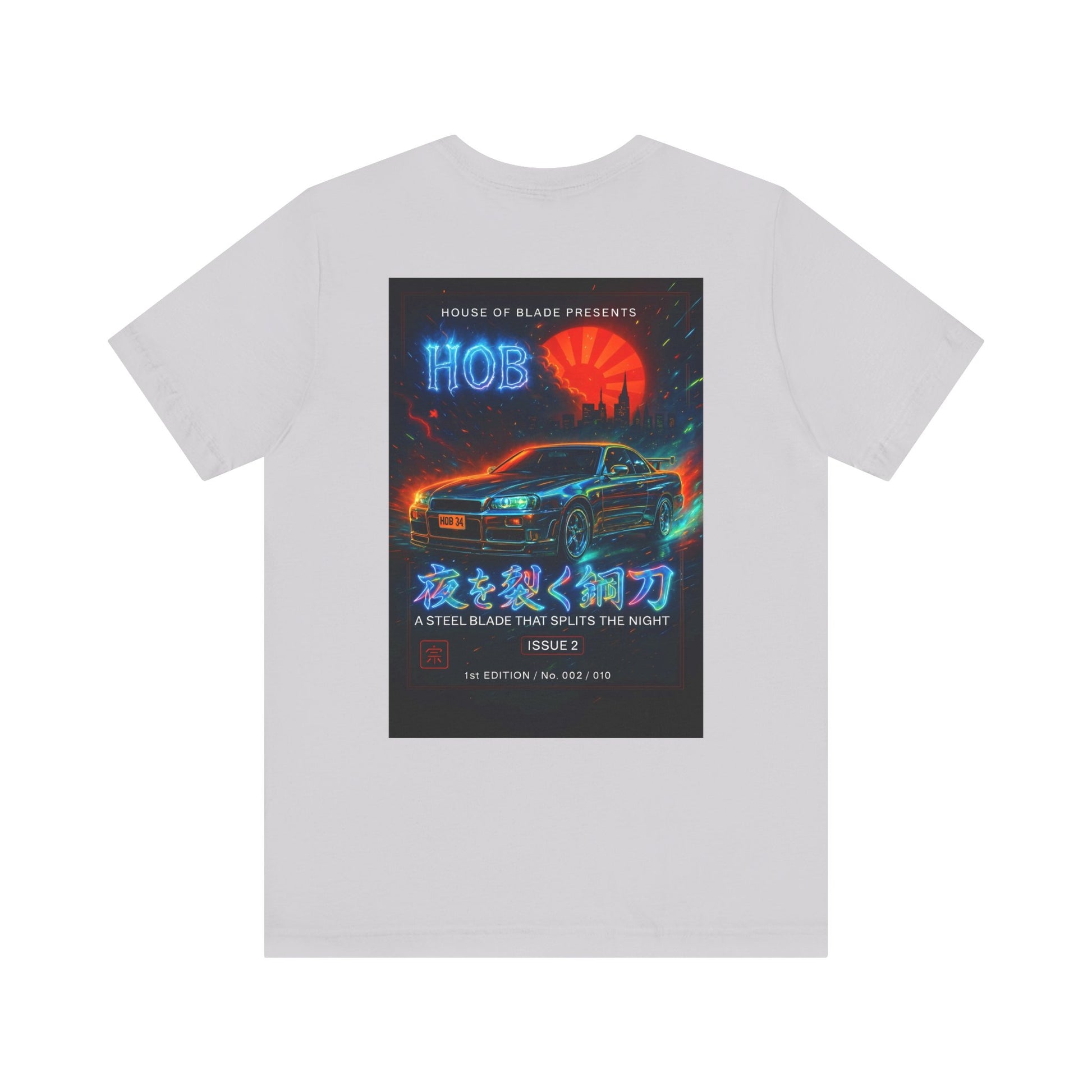 A tribute to midnight legends and neon-drenched streets — this special edition tee from House of Blade features a chrome R34 cutting through dusk, framed by the rising sun and Tokyo’s electric skyline. Embellished with glowing kanji, sparks, and a rainbow foil-authentic seal, this drop is No. 002 out of 010. For those who ride faster than fate — a steel blade that splits the night.
