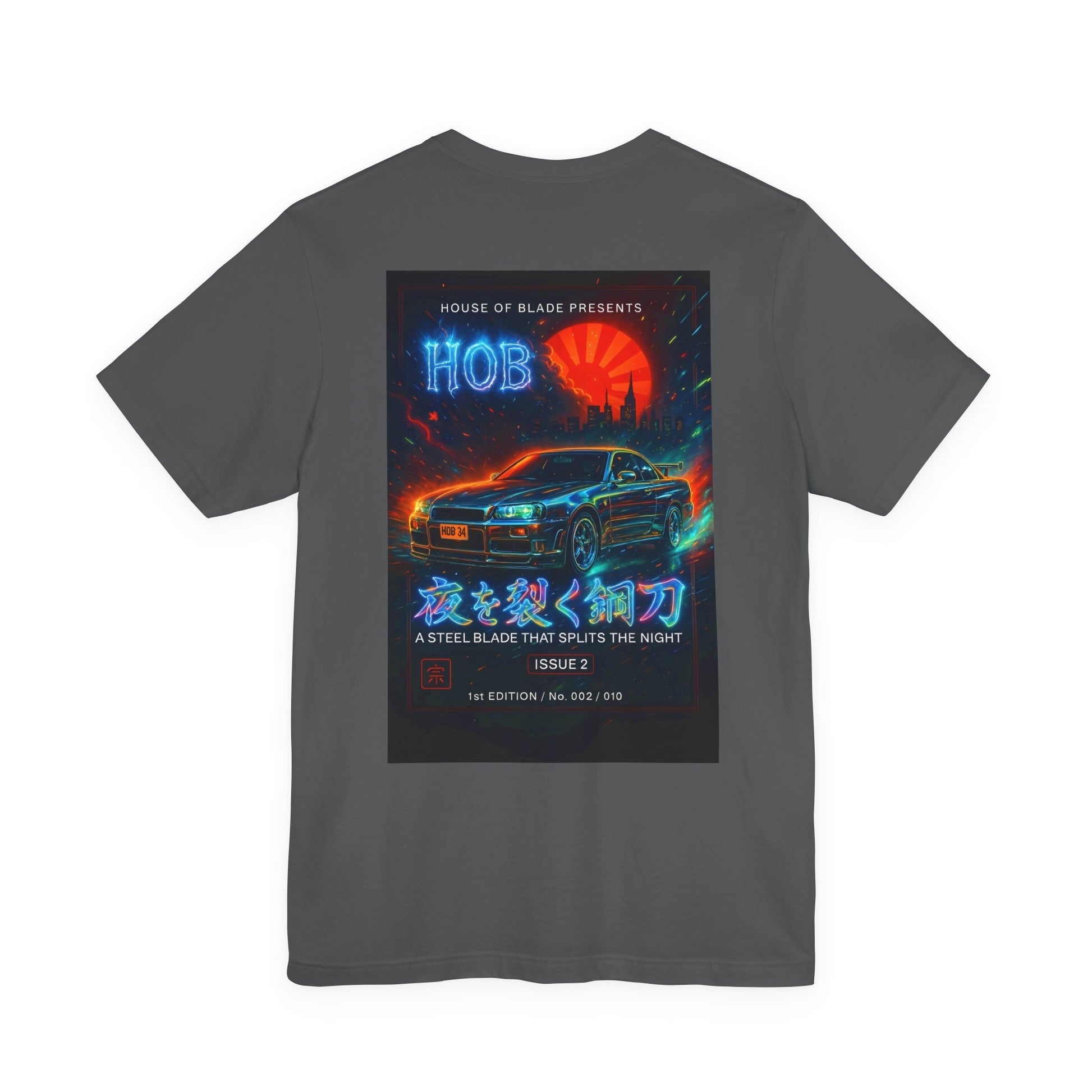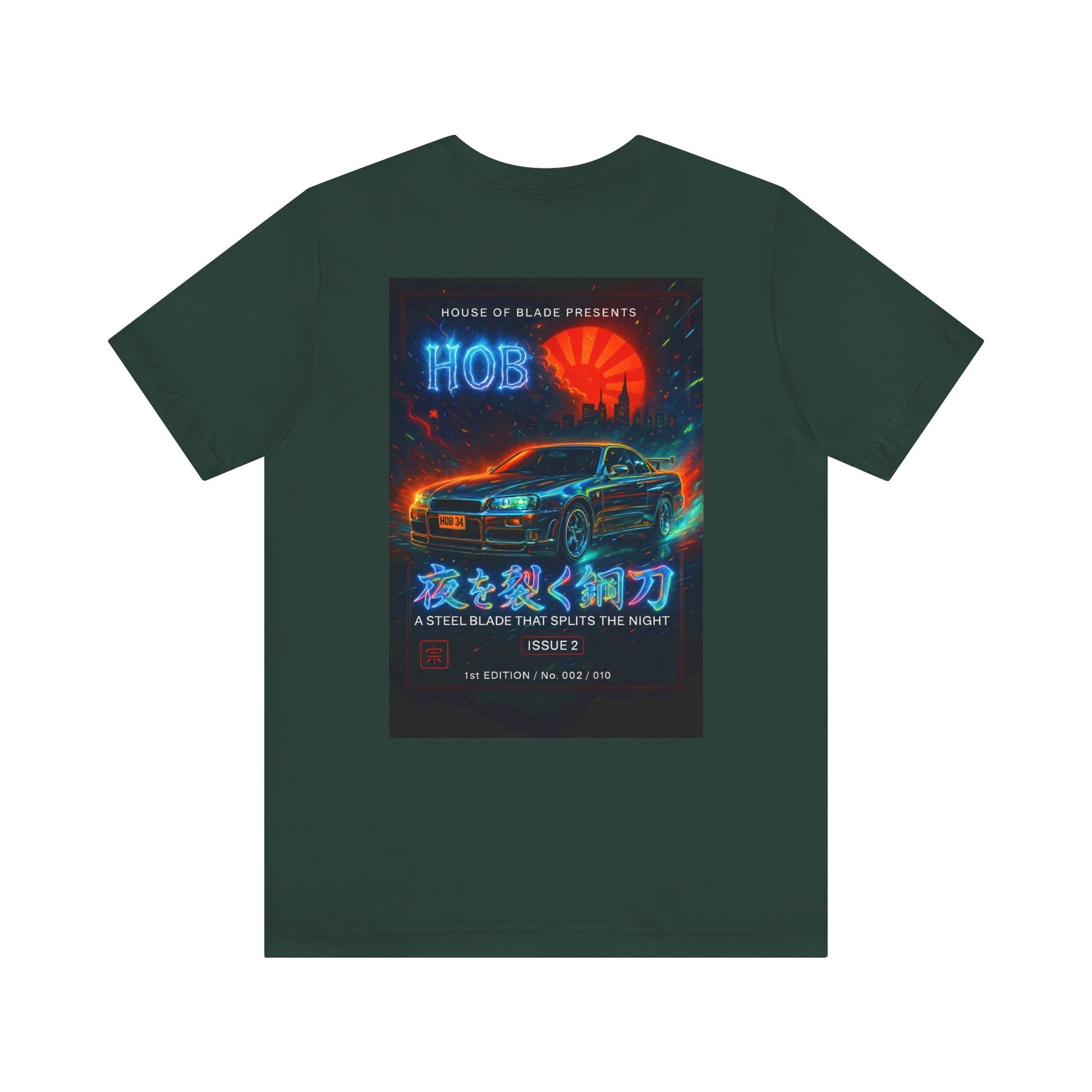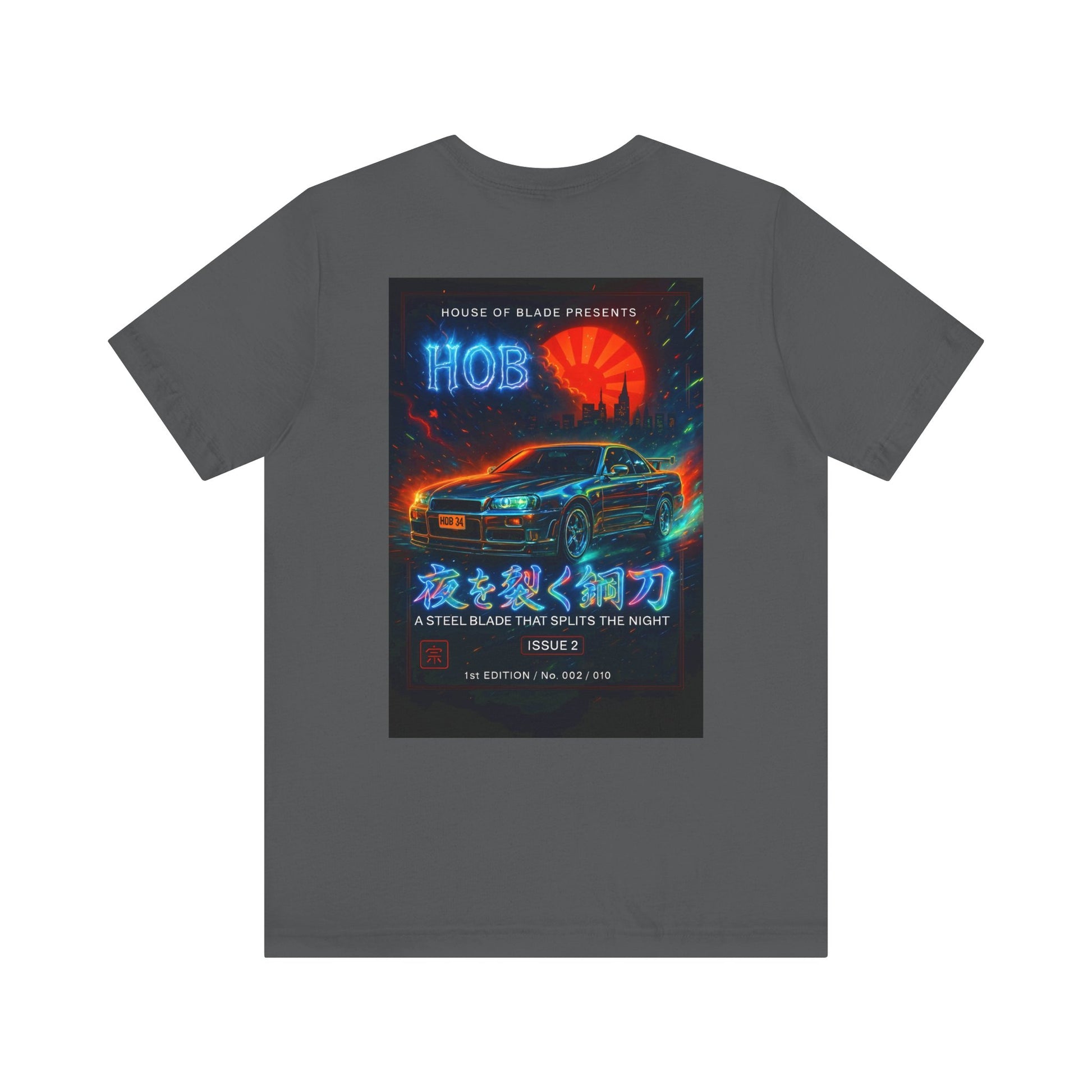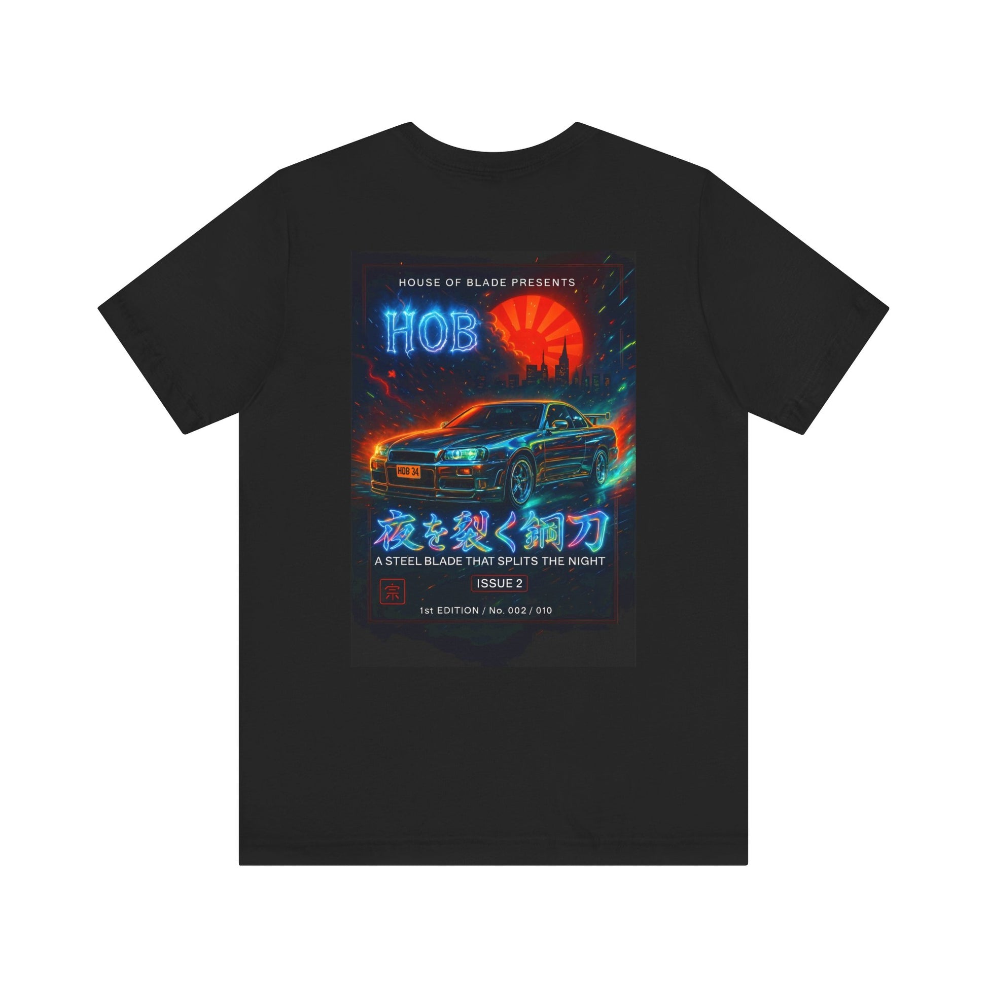 A tribute to midnight legends and neon-drenched streets — this special edition tee from House of Blade features a chrome R34 cutting through dusk, framed by the rising sun and Tokyo’s electric skyline. Embellished with glowing kanji, sparks, and a rainbow foil-authentic seal, this drop is No. 002 out of 010. For those who ride faster than fate — a steel blade that splits the night.