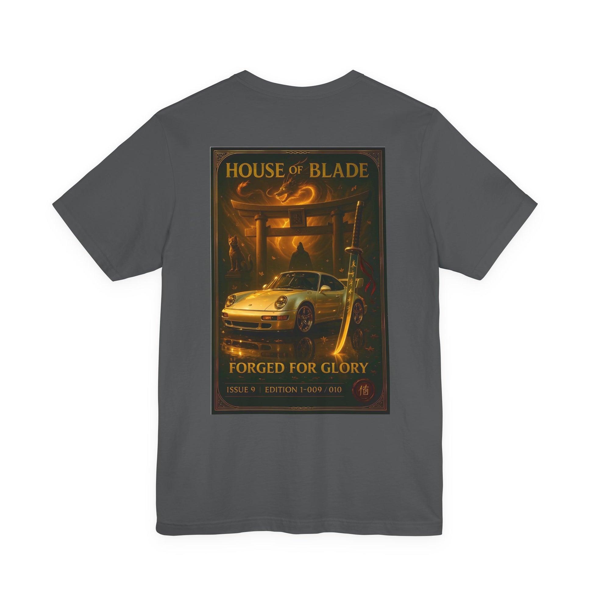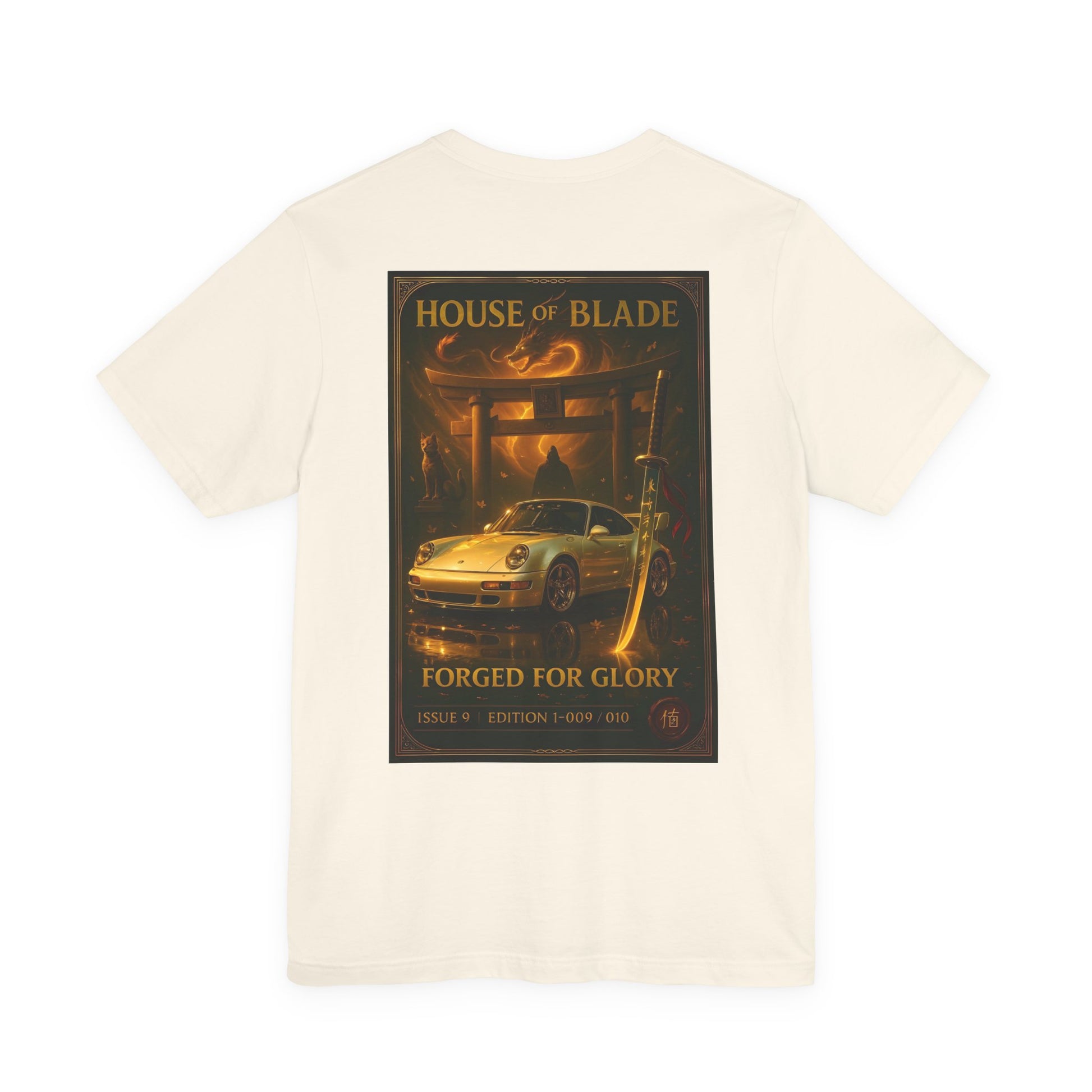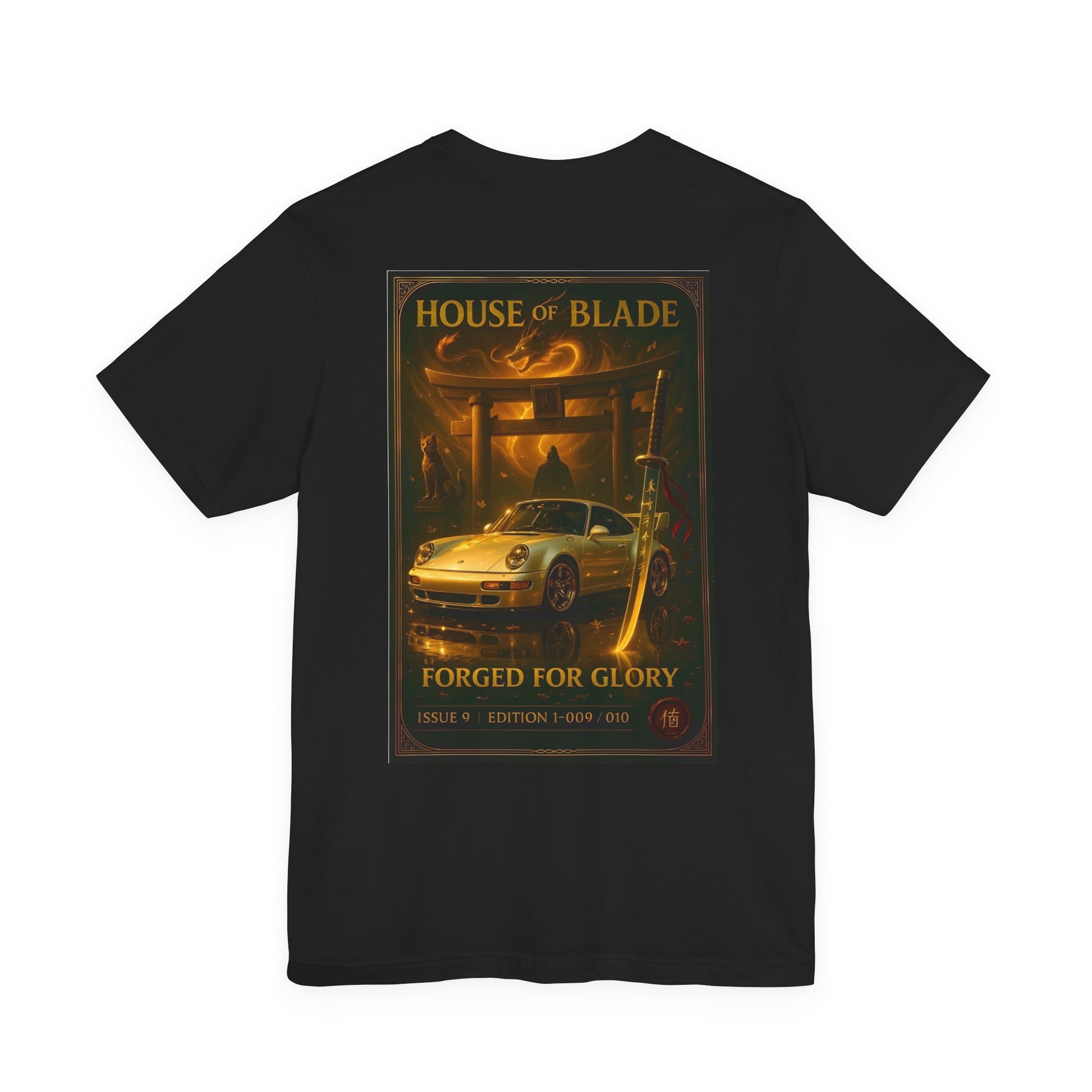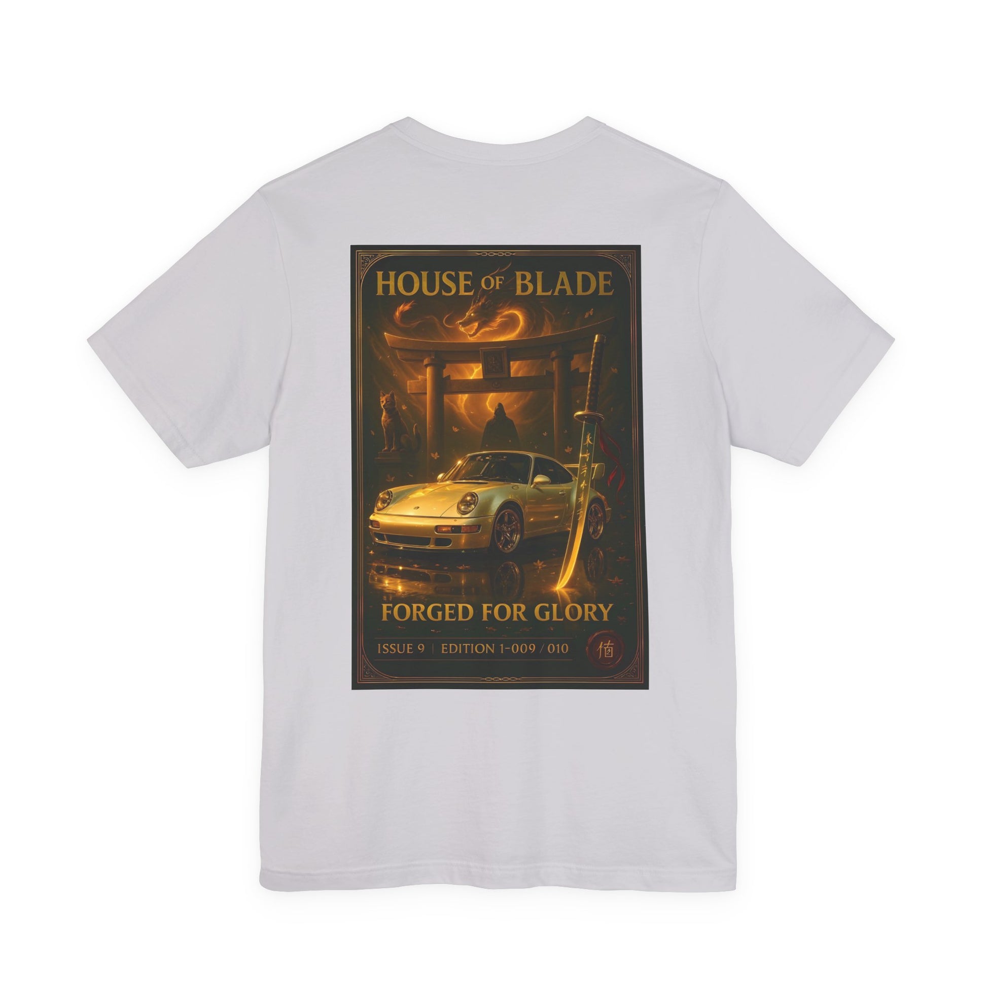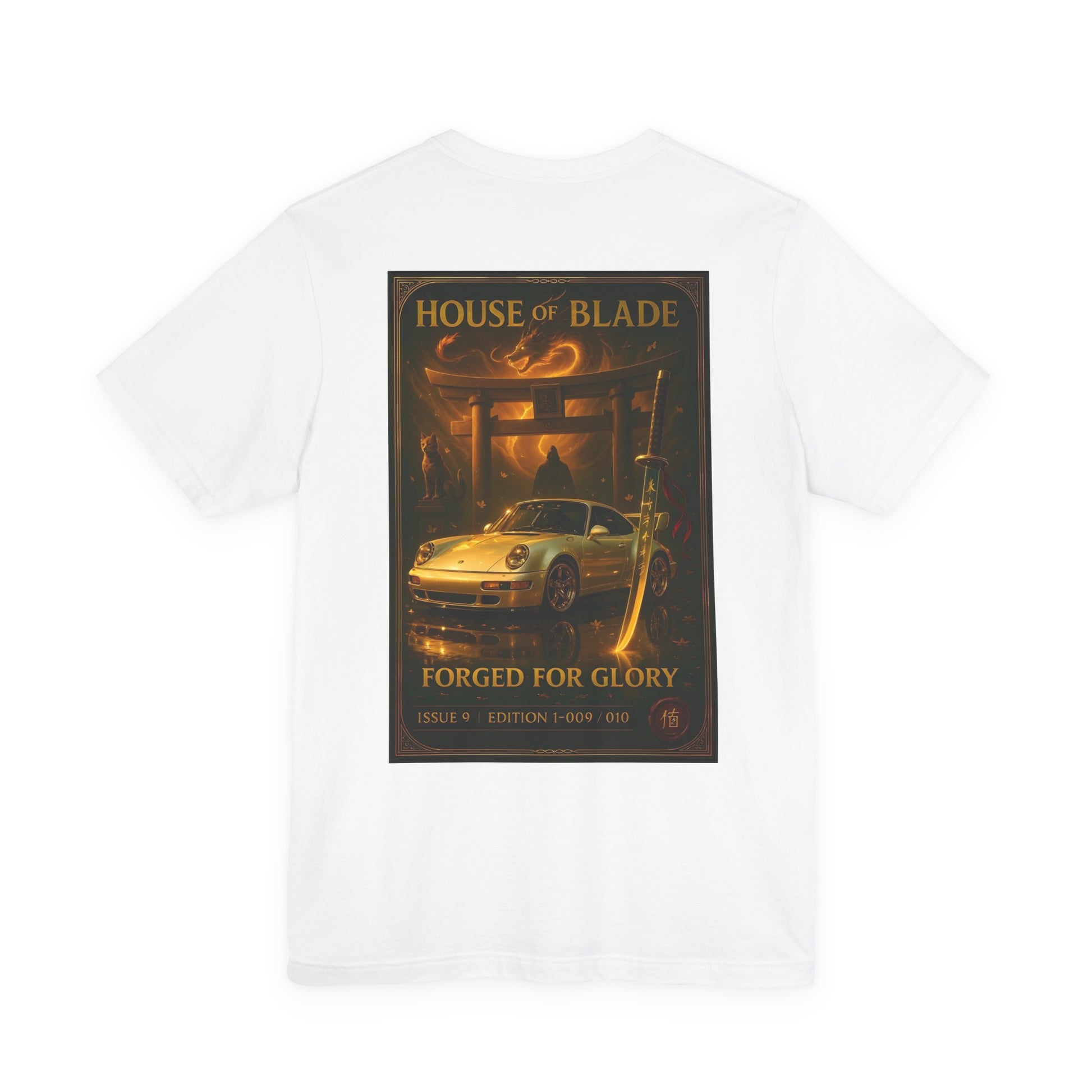 Step into the flames of legacy with the Forged for Glory tee from House of Blade – Issue 9, Edition 1 - 009 / 010. This limited-edition piece fuses JDM soul with samurai spirit, showcasing a radiant gold RWB 964 Porsche beneath a shadowy torii gate, guarded by a ceremonial blade. Gold reflections, fiery ambiance, and masterful composition define this back artwork, while the front bears a regal HOB crest—etched with elegance and authority. Printed on a premium white tee, this is more than a shirt—it’s a statement of drive, honour, and precision.