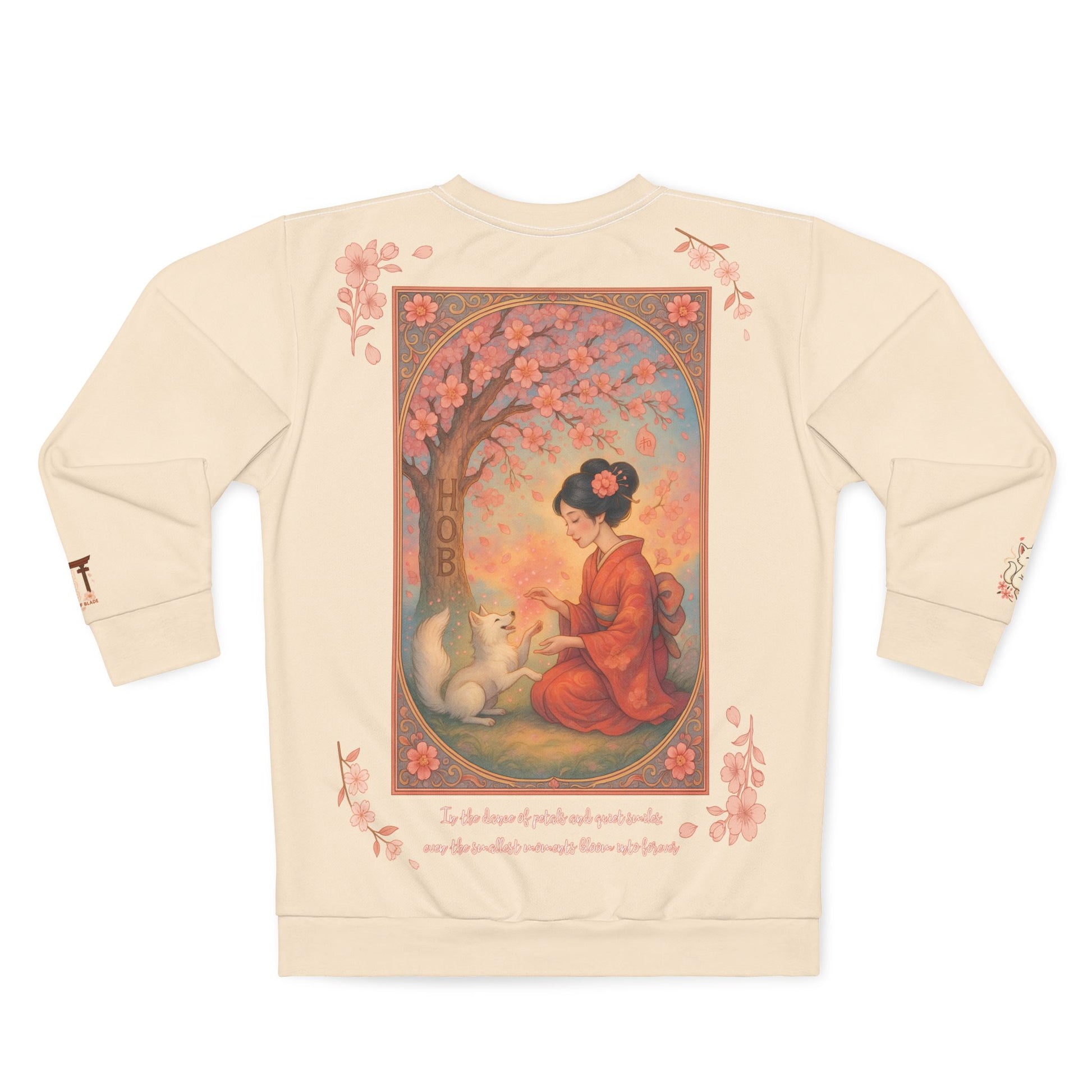 The tree above them is in full bloom, the air thick with pink blossoms falling like blessings. Each petal spins its own story as it descends — some of joy, some of sorrow, all destined to land where they’re needed most. The bark bears three letters: HOB — not carved in haste, but pressed into the wood like a promise: to protect the quiet, to honour the still, to remember that glory isn’t always loud.